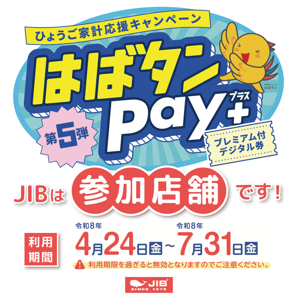 2026.04.23 OTHERS, Web更新info はばタンPay、JIB参加 4月24日から運用される兵庫県限定のeマネー「はばたんPay」。 こちらの対象店としてJIBも参加することと致しました。今までも運用検討の機会がありましたが、あるスタッフさんの「JIBもやってくれたらきっと喜ばれるのに」という一言から検討することになりました。色々な手間もかかりますが、お客様に喜ばれるということが、一番良いモチベーション。兵庫県下ということで直営全店舗が対象となります。盛り上げていきたいですね。 JIB参加「はばたんPay+(プラス)第5段」 Post Share Hatena Pocket RSS feedly Pin it 母の日に贈りたいバイカラーのバケツトートが登場! 関連記事 ◆web更新Info◆24/5/13 “YACHTING COLOR Series” JIB船坂・朝ヨガのご案内(2026/2/7) ◆web更新Info◆21/01/01 Happy Bag for Web Special 2021 ◆web更新Info◆21/2/11~ 新着商品 “7オンス ブラック・Lサイズトート” ●Event Info●26/4/22~大丸神戸店にてJIBフェア開催! ◆web更新Info◆20/7/24~ 新着商品 “Love For Medical Baketsu Tote Bag SS”
